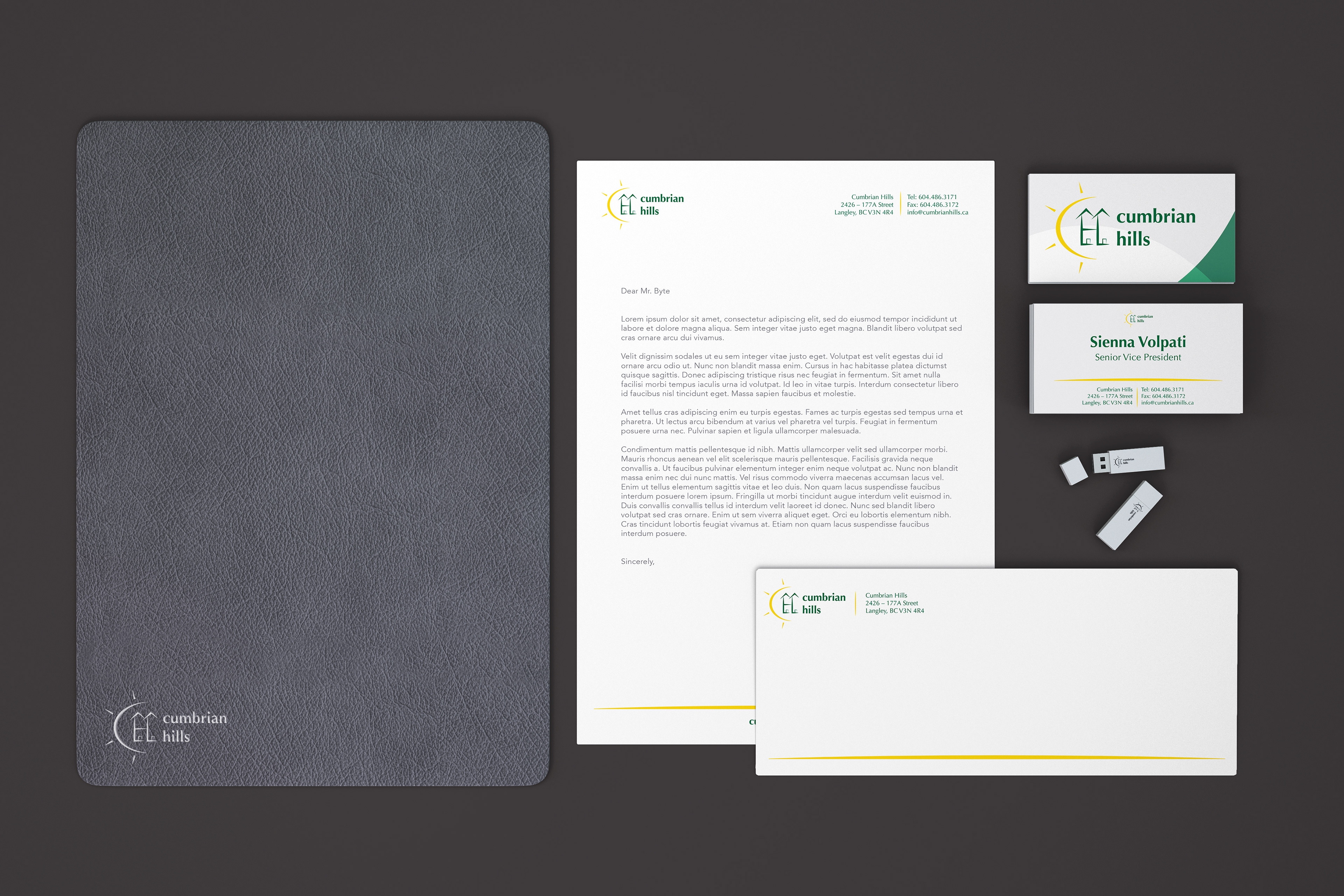 Being an environmentally conscious development, the color green was chosen to represent nature and a golden yellow to represent the sun. These colors combined with the use of all lowercase copy was chosen to show an overall warmth, softness, renewal and growth that comes with family and a new home. Lastly, shapes with contrasting characteristics were chosen to showcase the literalness of what the development is all about with round lines representing “Hills” and sharp right angles representing the precision of architecture. The C of "Cumbrian" is shown as the sun lighting up the H of "Hills" which forms two neighbouring homes.